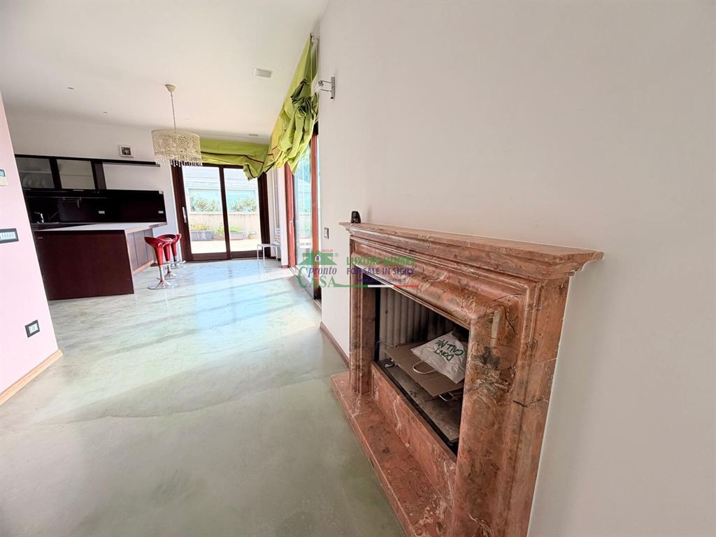 La zona living, ampia e rappresentativa, è impreziosita da un camino a legna in marmo e gode di accesso diretto alla terrazza di circa 70 mq, ideale per momenti di relax e convivialità.
