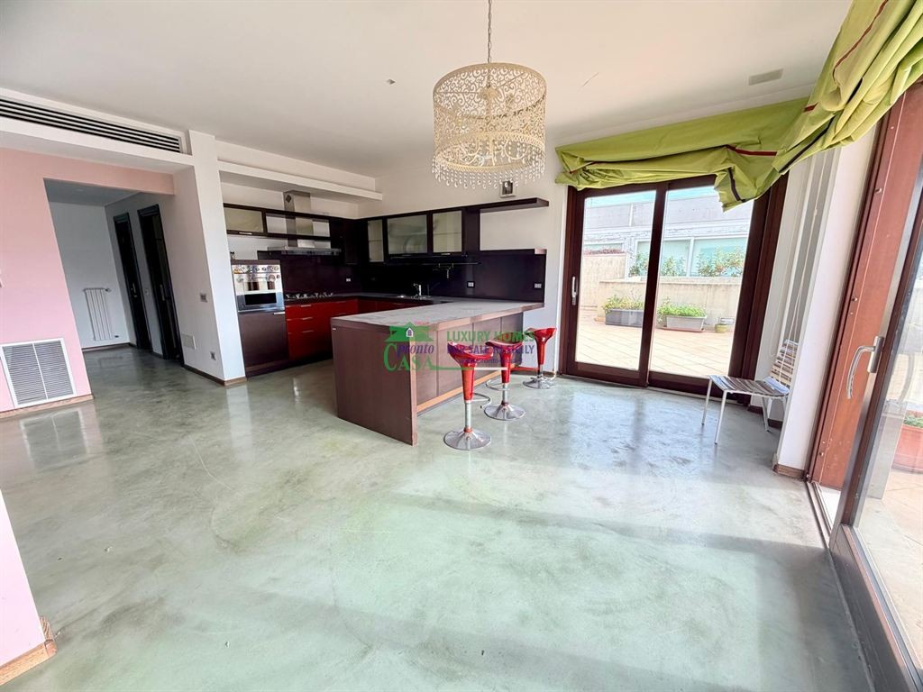 L’attico si sviluppa interamente su un unico livello per una superficie complessiva di circa 290 mq, posto al quinto piano ascensorato. L’intera abitazione è caratterizzata da pavimentazione in resina, che conferisce continuità, eleganza e un design contemporaneo a tutti gli ambienti.