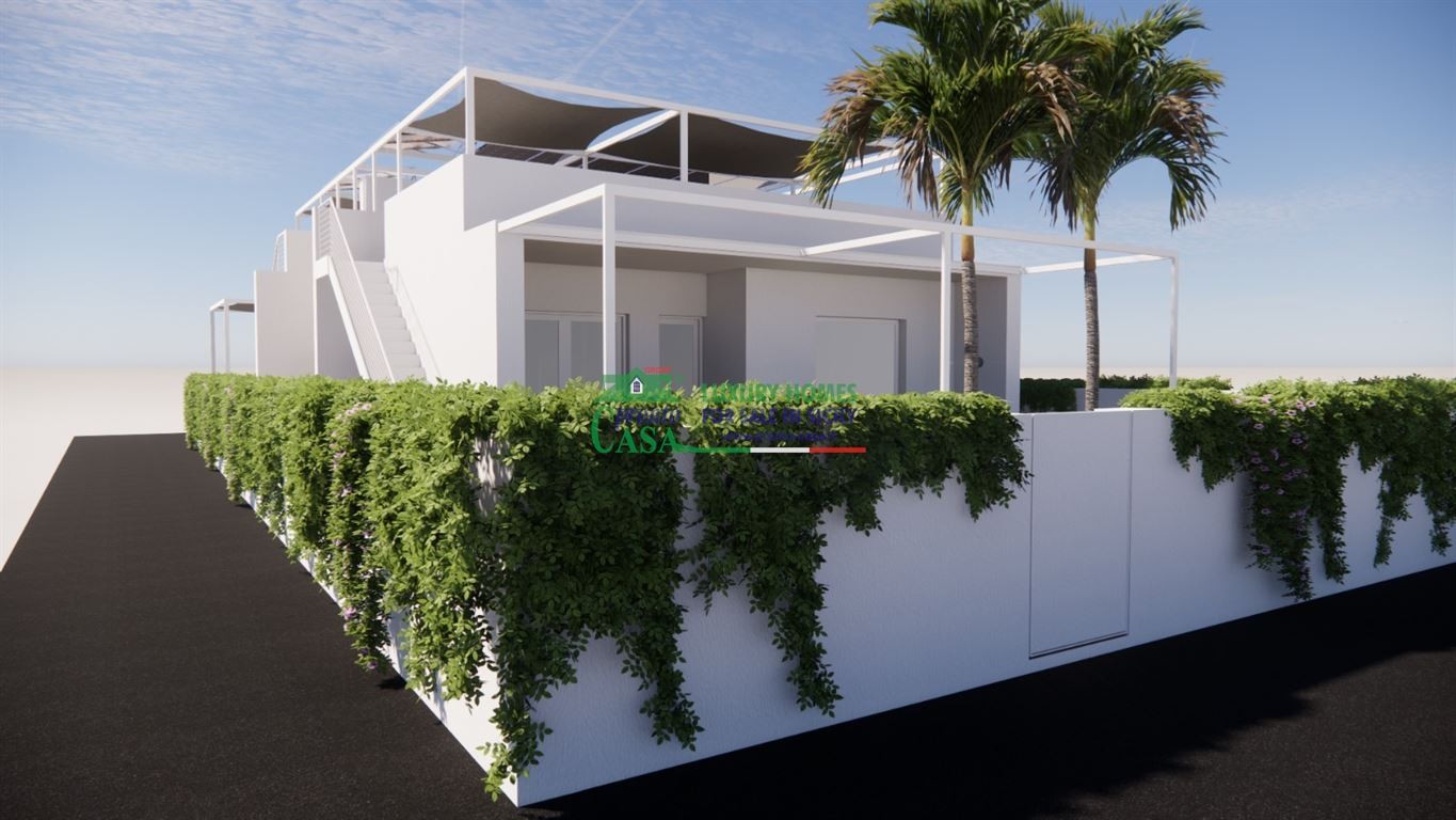 All'esterno abbiamo a pian terreno un' area all' aperto di circa 126 mq totali, dove trovano spazio un'ampia veranda, un piccolo giardinetto ed un comodo posto auto. Al piano superiore, accessibile per mezzo di una scala esterna, abbiamo uno stupendo terrazzo calpestabile di circa 54 mq, dove sono già previsti gli appositi impianti per realizzare una cucina esterna, con gli opportuni tendaggi per l'ombra.